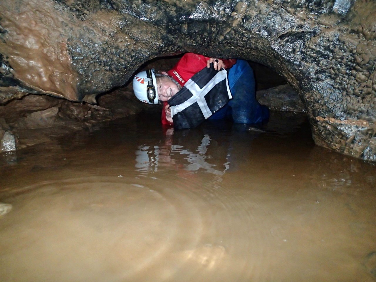 The photograph, taken by cave leader Gary Evans, is from 2022 in Llygad Llwchwr cave system where the flag got very wet.