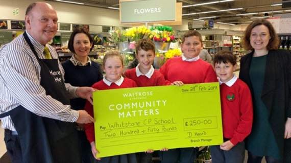 WHITSTONE Community Primary School’s pupils Chloe Martyn, Ollie Mould, Aaron Jones and Thomas Britton accompanied headteacher Hannah Mould to the Holsworthy branch of Waitrose to receive a cheque for £250 from branch manager Damian Heard.
